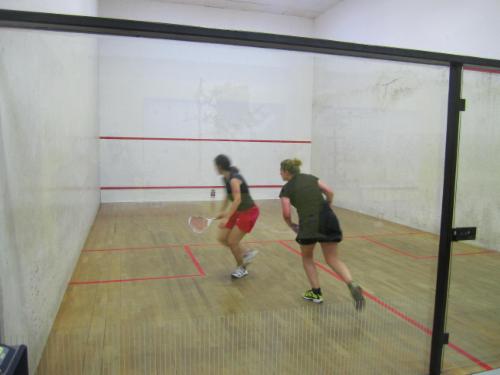 Chicas guapas y simpáticas no faltan en el squash asturiano. Marina arbitrando y Tati detrás disimulando.
